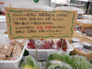 のんのこの野菜は、減農薬栽培、EM栽培をしていますので、 虫喰いで白菜、キャベツなどの中身が痛んでいる場合があります。 そのような場合は、返金・交換いたしますので、 遠慮なく店員までお申し付けくださいませ!