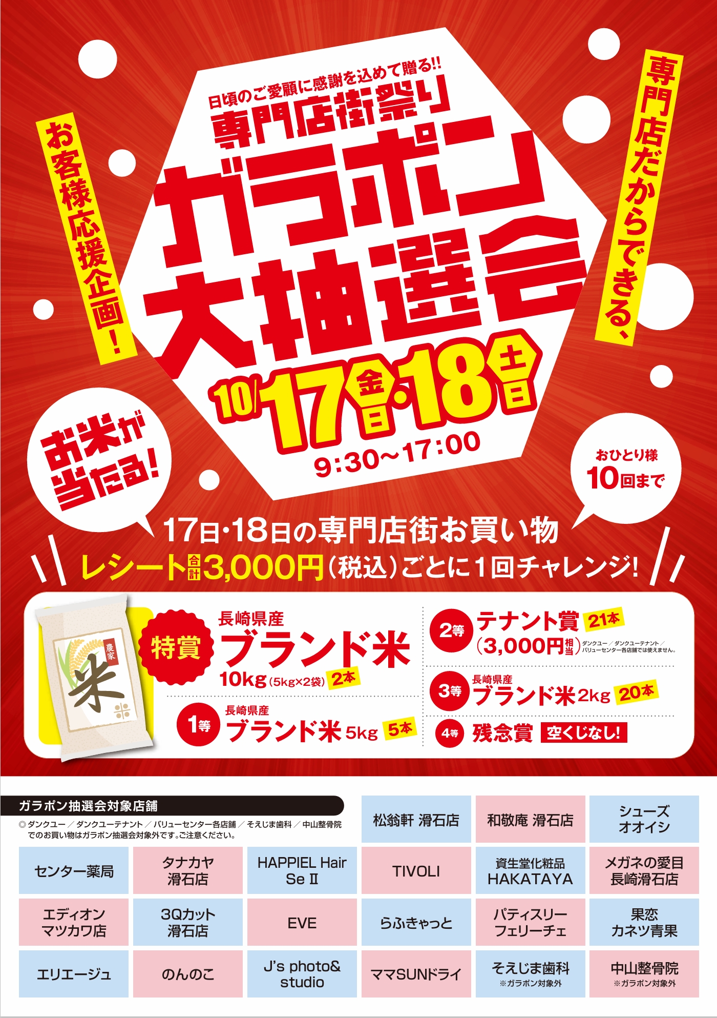 10月17日(金)・18日(土) 専門店街祭り ガラポン大抽選会 開催のお知らせ
